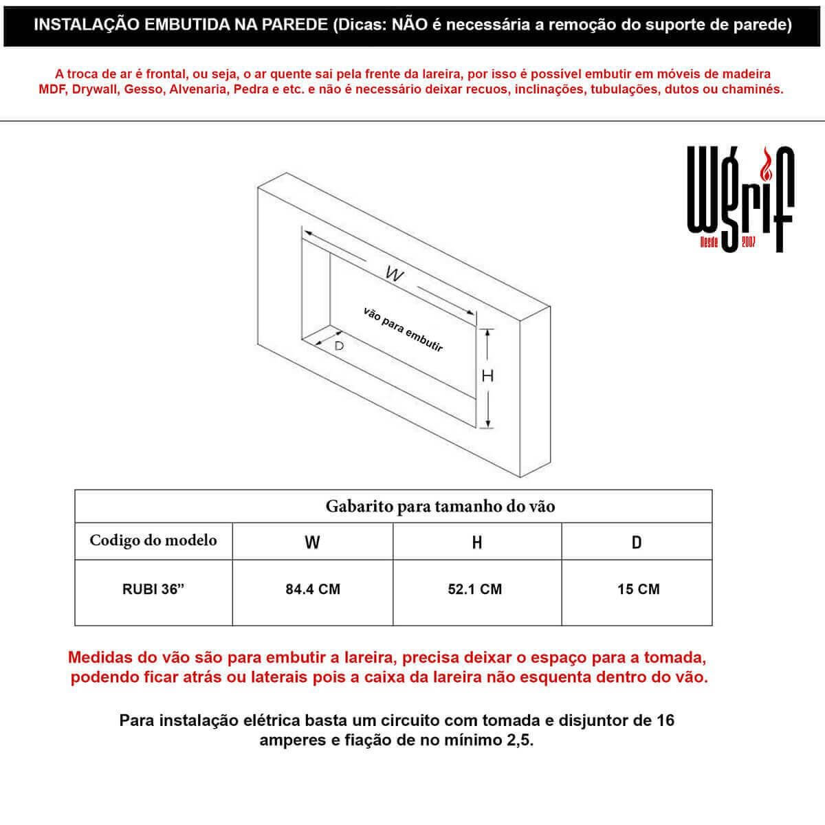 Lareira Elétrica Wgrif – “Modelo Rubi” (Para embutir totalmente ou Sobrepor)